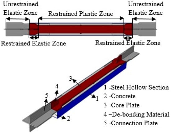 The lateral drifts and internal forces appear in cases where the structures are subjected to lateral forces instigated by strong ground motions or wind. The structural and non-structural members are damaged if these lateral drifts are excessive. In order to limit lateral drifts, using steel braces is one of the most well-known solutions for structures. One of the most important disadvantages in the design of the steel braces is that the tensile and the compression capacities are not equal or symmetric. Black et al. [1] reported that when the steel braces yielded under the large tension forces, they buckled under the compressive forces, and their axial load-carrying capacity suddenly decreased. This unsymmetrical hysteretic behavior in tension and compression results in a reduction in lateral stiffness and excessive damage to beams and columns in the steel braced frame. If the steel brace members are prevented from buckling, their hysteretic behavior can be shifted from unsymmetrical to symmetrical. For this reason, buckling restrained braces (BRBs) have become an attractive research topic among researchers all over the world. The BRBs consist of a core plate (CP), a casing member (CM), and debonding material (see Figure 1). The compression capacity of CP can be enhanced by using a CM or by preventing it from buckling, although it has negligible compression capacity. Therefore, the CP may yield in tension or compression or can buckle in high buckling modes. As can be seen in Figure 1, a conventional BRB has three parts, namely, an unrestrained elastic zone, a restrained elastic zone, and a restrained plastic zone.
