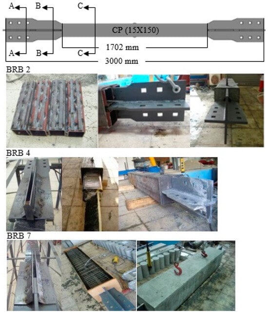 Ozcelik et al. [2] conducted an experimental program consisting of ten BRBs to explore the effects of different end restrainers and the CMs on the hysteretic behavior of BRBs. In the FE study of this paper, BRB2, BRB4, and BRB7 were used among the BRB specimens of Ozcelik et al. [2] in order to determine material parameters used for the CP and friction coefficient between the CM and the CP. The geometrical details of these BRBs are given in Figure 2 and Table 1.