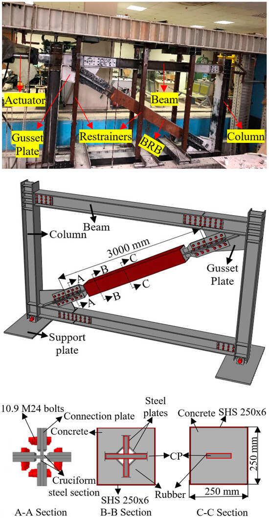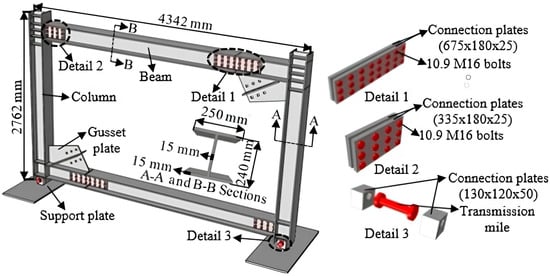 The geometrical properties of BRB used in the BRBF specimen were identical to those of BRB4, which was tested by Ozcelik et al. [2]. As can be seen in Figure 4, the CM with a concrete compressive cylinder strength of 25 MPa consisted of an SHS 250X6. The CP was made of a 15 mm thick steel plate wrapped with 4 mm thick rubber (see Figure 4). The additional end restrainers were provided with steel plates welded to each other to prevent local deformation at both ends of the BRB (see Figure 4). The yield stress of CP and members of the steel frame were determined to be 270 MPa and 330 MPa, respectively, from the tensile coupon tests. All connections in the BRBF were designed to allow for rotation so that all demands were withstood by the BRB. The boundary conditions were considered to be pinned connections, which allow for rotation. They were provided with high-strength transmission miles. The support plates were installed first. This was followed by the steel columns being assembled with support plates by using high-strength transmission miles. The details of connection with the transmission mile are given in Figure 3. The steel beams and steel columns were then connected to each other with high-strength 10.9 M16 bolts. The details of the connection between the steel column and beam are given in Figure 3. The BRB was lastly attached to the steel frame with high-strength 10.9 M24 bolts (see Figure 4) and the LVDTs with a 200 mm measuring capacity were placed to measure the displacements in the BRBF. The yield and the tensile strengths were 900 MPa and 1000 MPa, respectively, for all high-strength 10.9 bolts with respect to TSC [43].