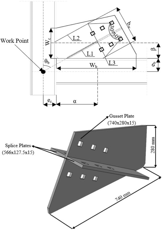 The bolted connection with slotted holes between the BRB and gusset plate was used to ensure easy installation of the BRB. In order to prevent the slip in these connections, they were designed according to the slip-critical connection design provisions in the TSC [43]. The gusset plate was designed with respect to the Uniform Force Method (UFM) given in the American Institute of Steel Construction (AISC) [44]. The size of the gusset plate was determined by solving equilibrium equations about the working point, which is the intersection point of axes of the beam, column, and brace members (see Figure 5).