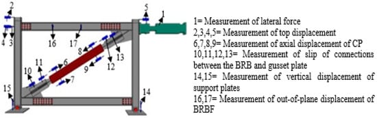 In addition, the measurement of lateral forces, top displacement of BRBF, axial displacement of CP, slip of connection between the BRB and gusset plate, vertical displacement of support plates, and out-of-plane displacement of BRBF were carried out by the LVDTs during the test. The positions of the LVDTs are given in Figure 6.
