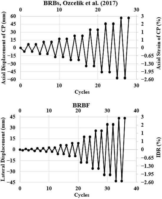 The lateral excursion was based on the strain of CP for the BRB members [2] and the inter-story drift ratio (IDR) for BRBF. The BRBF was loaded up to 2.5% IDR using the displacement-controlled hydraulic actuator. In this study, subassembly test procedures were adopted with respect to AISC [44]. The loading protocol of the BRB specimens [2] was as follows: 1/3δy, 2/3δy, 1.0δy, 1/3δstr, 0.5δstr, 1.0δstr, 1.5δstr, 2.0δstr and 2.5δstr, where δy and δstr were the axial yield displacement of the CP and the displacement value corresponding to 1% strain of the CP, respectively. The loading protocol of BRBF was as follows: 0.3% IDR, 0.5% IDR, 0.75% IDR, 1.0% IDR, 1.5% IDR, 2.0% IDR, and 2.5% IDR. Two cycles were performed for each displacement defined in both loading protocols. These loading protocols are shown in Figure 7.