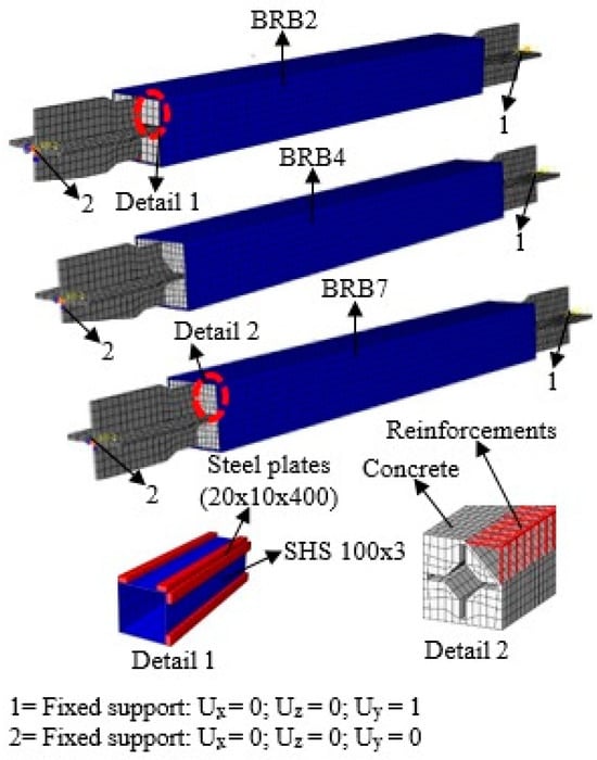 The BRB2, BRB4, and BRB7 had the same CP, but their CMs were different [2]. The additional end restrainer of BRB2 was formed by welding 20 × 10 steel plates on the alignment of SHS 100 × 3. The tied constraint was used to simulate the welded connection between their surfaces. It was also used between the steel tubes and concrete for FEM of all BRBs because no slip was observed between them during the test. The CM of the BRB7 consisted of reinforced concrete. The reinforcements were modeled using two node truss elements (T3D2). The truss elements were joined to the concrete solid element using embedded constraints. The reference points were connected with the surfaces at both ends of the BRBs using a continuum-distributing coupling constraint. The boundary conditions were defined in these reference points. The FEM of all BRBs is given in Figure 10.