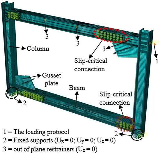 The 3D FEM of the steel frame with slip-critical connection was developed by using Abaqus software [39] to simulate its cyclic response (see Figure 11). The pretension load on the bolts and the friction coefficient between the steel plates are the most important parameters for the behavior of slip-critical connections. The 10.9 M16 high-strength bolts were used in the slip-critical connections. A pretension load of 110 kN was applied for each bolt, according to TSC [43]. Except for the slip-critical connections of the steel frame, its other components were welded to each other; hence, the tied constraint was used between them. All slip-critical connections in the steel frame were modeled according to the contact model, as given in Figure 9. The tensile coupon test was not performed on 10.9 M16 bolts; therefore, their mechanical properties were taken with respect to TSC [43]. Hence, their yield and ultimate stress were taken to be 900 MPa and 1000 MPa, respectively. The yield stress of other components of steel frame were 330 MPa according to results of their coupon tests. The calibrated material models given in Table 2 were used for the FEM of steel frame. To calibrate the value of friction coefficient between the contact surfaces of steel plates of the slip-critical connections, a numerical parametric study was performed by using different values of friction coefficient. The analysis procedure consisted of three steps. In the first step, the boundary conditions were defined with continuum-distributing coupling. In the second step, the pretension load was applied on the bolts. In the final step, the cyclic loading protocol mentioned in previous section was horizontally applied to the steel frame. A comparison of the numerical and test results is given in Section 4.