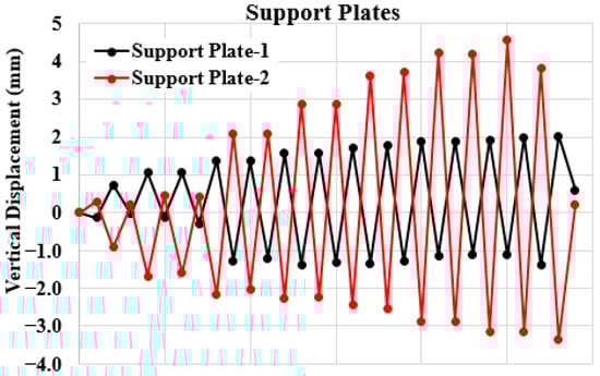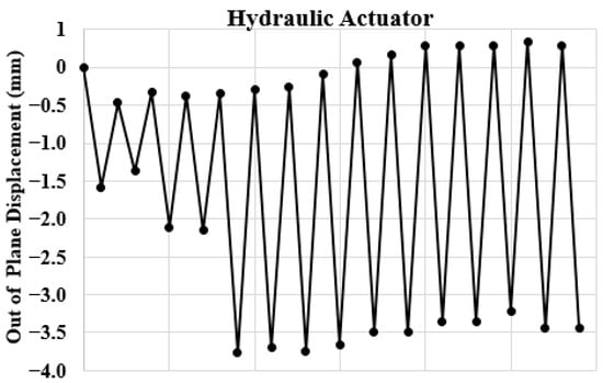 The 3D FEM of BRBF was developed by using the Abaqus software [39], as shown in Figure 12. The 10.9 M24 bolts were used for connections between the BRB and the gusset plate. Based on the recommendation of TSC [43] for the minimum value of the pretension load, 247 kN, was applied to each 10.9 M24 bolt. No slip was observed in these connections during the test. The out-of-plane displacements from the hydraulic actuator and vertical displacements from the support plates were measured during the test. Therefore, these displacements were applied as the external load to the FEM of the BRBF. These displacements are shown in Figure 13. The slip was not measured in the slip-critical connection of the steel frame during the test. Therefore, different values of pretension load were applied to 10.9 M16 bolts, thereby allowing for a numerical parametric study to investigate the effect of the pretension load on the cyclic behavior of BRBF. In this phase, the value of the friction coefficient between the CP and CM was taken to be 0.05 due to the best numerical results matching the test results. Similarly, the value of the friction coefficient between the contact surfaces of steel plates in the slip-critical connections of steel frame was taken to be 0.2. The yield stress of CP was obtained as 330 MPa from its coupon tests. Therefore, in the FEM of BRBF, the yield stress and young’s modules of CP were taken to be 330 MPa and 210,000 MPa, respectively. A numerical parametric study was conducted using the calibrated material models on BRBF. A comparison between the numerical analysis and the test results is given in the next section.