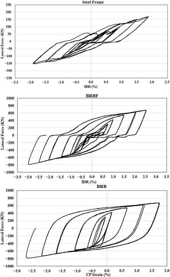 The component test results of the BRBs are available elsewhere [2]; hence, further details are not given in this paper. The steel frame was tested by using the cyclic loading protocol given in Figure 7. This was performed to determine the bare frame capacity and cyclic behavior steel frame. Hence, it allowed for the determination of the contribution of the BRB member to the braced frame. The cyclic response of the steel frame and BRBF is presented in Figure 14. This figure shows the lateral force versus IDR for both the steel frame and the BRBF, and the lateral force versus CP strain for the BRB. The IDR was the ratio between lateral displacement and height of the steel frame (2265 mm). The value of the axial displacement of CP was measured from LVDTs (6–9 in Figure 6). The value of axial strain of CP was the ratio between the average displacement LVDTs (6–9 in Figure 6) and the length of the CP (1702 mm). The steel frame remained within the elastic limit during the test and its maximum tensile and compression lateral forces were measured as 170 kN and 154 kN, respectively. In addition, the maximum tensile and compression lateral forces of BRBF were measured as 677 kN and 788 kN, respectively. The out-of-plane displacement of BRBF and slip between the BRB and gusset plate are summarized in Table 4.
