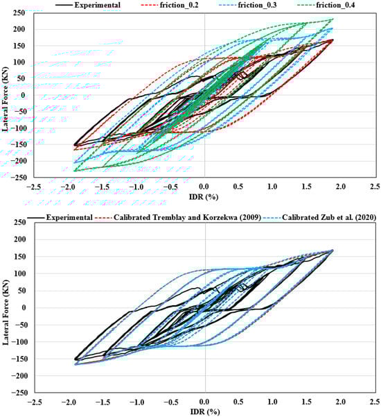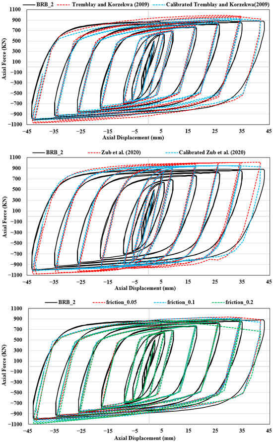 The different values of the friction coefficient (0.05, 0.1, and 0.2) for the tangential behavior in the numerical analysis were used to observe their effects on the numerical cyclic response of BRB2. In addition, the material models [27,41] were calibrated by matching the test result of BRB2. Figure 16 shows the effects of both calibrated material models and friction coefficients on the numerical hysteretic behavior of BRBs. The numerical cyclic behavior of BRB2 exhibited good agreement with the test results when the value of the friction coefficient between the CP and CM was taken to be 0.05. Both calibrated material models gave approximately identical numerical results for all BRBs [2] (see Figure 17).