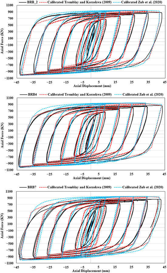 Prediction of hysteretic behavior of BRBs using the calibrated material models based on their test results [36,46].