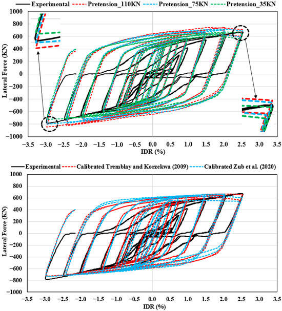 In this phase, the pretension load was applied to 10.9 M16 high-strength bolts, which were used for slip-critical connections of the steel frame, and the slips on the steel plates used for the slip-critical connections of the steel frame were not measured during the test. Therefore, the effect of the pretension load was investigated on the numerical hysteretic behavior of BRBF. In addition, a comparison of the numerical results of calibrated material models with the test result is also given in Figure 19. In addition, the R2 scores for both calibrated material models were determined by the quantitative statistical error analysis to clarify their ability to predict the test result. As this score has a high value, the material model has good prediction abilities. The maximum and minimum lateral forces corresponding to each IDR defined in the loading protocol and values of R2 scores for both calibrated material models are summarized in Table 5.