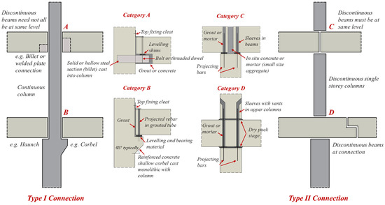 Beam–column connections play a crucial role in precast skeletal frames, serving as the most significant type of connection within this structural system. Typical beam–column connection types are presented in