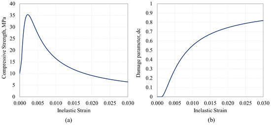 33]. While the curve does not directly depict cyclic behavior, the CDP model employs internal damage factors to replicate stiffness deterioration, a decrease in unloading slope, and inelastic residual stresses under reversed cyclic loading. The effects are regulated by factors including the compression damage variable, plastic strain thresholds, and viscosity regularization, as originally defined by Lee and Fenves [