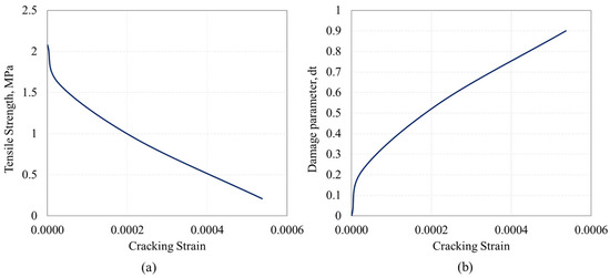 35], among others. By integrating tension stiffening into analytical frameworks, the potential for sudden crack initiation is diminished, resulting in a more even distribution of damage within structural components subjected to flexural or tensile stress. Consequently, this research adopted this methodology to establish the tensile stress–strain curve for concrete, exemplified in