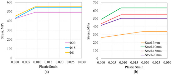 In the specification of materials for steel reinforcement, critical parameters such as bulk density, modulus of elasticity, and Poisson’s ratio were incorporated into the program to characterize the elastic zone and physical properties. For the plastic properties, yield stress and plastic strain values were integrated. The modulus of elasticity for the reinforcement steel was established at 200 GPa. A representative stress–plastic strain curve for steel reinforcement, derived from experimental data [