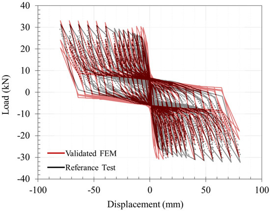 15], was established. Subsequently, the cyclic load applied in the referenced experiment was imposed on this model. The Concrete Damaged Plasticity (CDP) material model offers a well-established framework for simulating the nonlinear post-cracking behavior of RC members under cyclic or dynamic loads. The CDP model transitions from an elastic state to one defined by tension cracking, compression softening, and stiffness degradation under cyclic loading. This approach significantly differs from a simple elastic–perfectly plastic model, as it incorporates tensile damage, strain-softening effects, and the gradual reduction in concrete’s load capacity post-microcracking. It also considers compressive crushing and the associated decline in concrete stiffness.