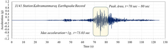 The analysis specifically isolates a critical 10 s interval surrounding the record’s peak acceleration, concentrating on the phase of peak acceleration to capture essential inelastic responses. The ground motion considered is illustrated in