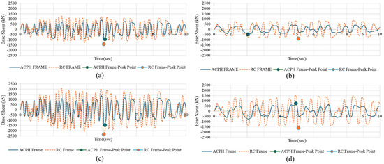 Figure 11a for the 1B1S frame reveals that the maximum base shear force for the RC frame is 1400 kN, whereas the ACPH frame reaches a lower peak of 934 kN. This demonstrates a substantial decrease of 51% in base shear for the ACPH frame when compared to its RC equivalent. Temporal analysis indicates that the RC frame achieves its maximum base shear at 5.09 s, while the ACPH frame does so slightly earlier at 5.03 s during the recorded earthquake event. In