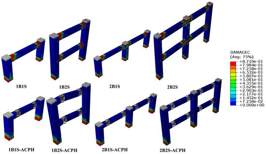 An analytical examination of the beams within the 2B1S and 2B2S frame configurations reveals that the highest extent of compressive damage, as delineated in the reinforced concrete (RC) frame, near the exterior columns and adjacent to the middle column’s face, reached a value of 0.87. Furthermore, compressive damage was additionally identified in the beam–column joint area associated with the middle column. When analyzing the ACPH frame, the extent of compressive damage near the column face and within the joint area of the middle column is observed to be approximately 0, with no compressive damage recorded in the middle beam situated between the ACPHs. These findings are consistent across both two-story and one-story frames; the increment in story count did not significantly affect the compressive damage levels, given that the damage recorded at the first story was sufficiently low.