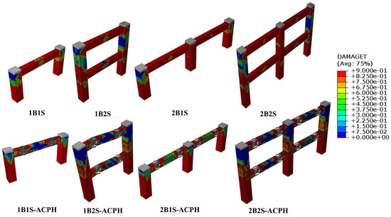 The damage visualizations in this section correlate to the time step at which the frame exhibits its highest seismic reaction, often linked to peak base shear or inter-story drift. The findings do not represent the conclusive stage of the investigation but rather the peak of structural demand, which most clearly demonstrates damage localization. An analysis of damage patterns in concrete has been conducted using the tension and compression damage variables established in the CDP model. This analysis reveals significant differences between frames employing traditional RC beam–column joints and those equipped with ACPH devices. In conventional frames lacking an artificial hinge, beam ends situated near the column faces tend to experience considerable tensile cracking, as evidenced by elevated tension damage values. Furthermore, compressive failure may arise at the upper or lower fibers of the beam if subjected to substantial inelastic rotations. Such cracking can sometimes extend into the edges of the column, resulting in a widespread damage zone that undermines the structural integrity of the joint. Conversely, the introduction of the ACPH subassembly results in the tension and compression damage distributions within the RC being largely contained to minor cracking areas that occur at mid-span or around the column base. This pattern of damage is notably less severe than that observed in traditional RC joints. The predominant inelastic demands are instead transferred to the steel hinge plates, which display distinct yielding as indicated by plastic strain contour plots, particularly in regions where the replaceable fuse element is intentionally designed to be weaker in bending. This concentration of steel deformation mitigates the risk of extensive cracking or crushing in the surrounding concrete, thereby safeguarding the stability of both the beam and column.