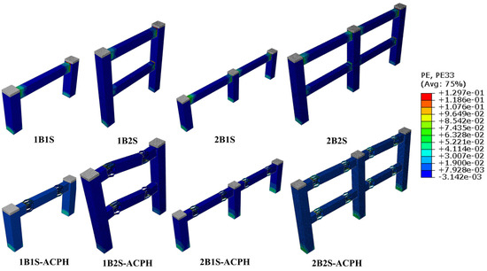 Figure 14) support this trend even further. Plastic deformation was common in RC frames and ran into both beam ends and column edges. In frames with ACPH, plastic stresses, however, were severely localized within the energy-dissipating steel plates. While the surrounding concrete remained mostly elastic, the PE33 values in some areas hit critical yielding levels. Corresponding to the 3 mm Q235 steel fuse plates, this plastic concentration was particularly chosen for its flexibility and low yield strength in relation to other structural components.
