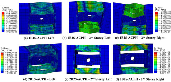Figure 15. This metric involves quantifying both normal and shear stresses to characterize the point of material failure, specifically in terms of yielding. The evaluation of von Mises stresses across the frames revealed that the replaceable joints in all configurations exhibited stress distribution consistent with their intended design. The primary expectation for these joints is that the 3 mm-thick energy dissipation plates located in both the upper and lower sections will first reach their yield strength and undergo plastic deformation, while the remainder of the joint structure remains in the elastic range. Consequently, it is evident that all frames demonstrate that the replaceable joints function as designed. Notably, in the joint region of the central column, identified as the area experiencing the highest stress, there was a significant contribution to maintaining the column’s performance within elastic limits, aligning with the intended function of the joint.