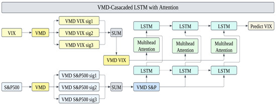 In the first processing stage, the aggregated VMD components of the S&P 500 (VMD S&P 500) are passed through an LSTM layer, which captures sequential dependencies and extracts essential trend information. Meanwhile, the aggregated VMD components of the VIX (VMD VIX) are processed separately using a Multi-Head Attention mechanism, enhancing the model’s ability to focus on critical patterns in market volatility. In the second stage, the outputs from these two processes—the LSTM-extracted features from VMD S&P 500 and the Attention-enhanced features from VMD VIX—are combined and fed into another LSTM layer. This final LSTM layer integrates information from both market trends and volatility fluctuations, further refining the VIX prediction.