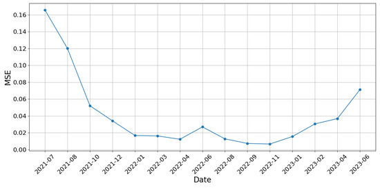 Figure 5 presents the MSE values for each step of the rolling-window evaluation. The model maintains stable predictive accuracy across most periods, though slight performance degradation is observed during highly volatile intervals (e.g., mid-2021 and mid-2023), consistent with expectations in financial time-series forecasting.