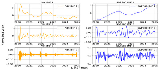 The statistical analysis results indicate that VIX data exhibit high skewness (2.5211) and kurtosis (11.1301), reflecting frequent extreme market events. In contrast, S&P 500 data follow a near-normal distribution with slight positive skewness (0.2480) and a kurtosis close to zero (−0.0865). The Jarque–Bera test confirms that both datasets significantly deviate from a normal distribution. Moreover, the Augmented Dickey–Fuller (ADF) test results show that VIX data are stationary, whereas S&P 500 data are nonstationary. These findings highlight the necessity of proper preprocessing techniques, such as VMD, to address the nonstationary characteristics of the S&P 500 data and account for extreme events in the VIX data.