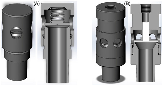 The air and oxygen branches are then joined (IS) and interconnected to a port for connection of the patient circuit. The IS coupling also interconnects these pneumatic circuits with a safety relief valve (BV) which is used to protect the patient from airway pressures exceeding 6 kPa (approximately 60 cmH2O) according to ISO standard [22]. The drawing of the safety relief valve design and its cross-section are shown in Figure 5A. An analog pressure gauge M1 indicates the pressure at the inlet to the patient circuit, but the precise Paw pressure is displayed on the ventilator screen and measured by the CoroQuant. The M1 pressure gauge provides the ventilator operator with information about the pressure throughout the entire respiratory cycle and is only an additional modality.