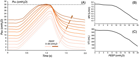 (A) Paw and its pressure limitation during the whole respiratory cycle for eleven different PEEP settings. (B) The dependance of measured MV on different PEEP settings during pressure limitation. (C) The dependance of measured inspiratory tidal volume on different PEEP settings during pressure limitation.