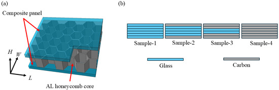 In this study, carbon fiber and glass fiber plain preform were provided by Wuxi Shengtai Carbon Fiber Products Co., Ltd. (Wuxi, China), and Anqing Kaful New Material Technology Co., Ltd. (Anqing, China), respectively. The aluminum honeycomb cores were provided by Foshan Shunde District Huiyu Honeycomb Material Co., Ltd. (Foshan, China). The specific performance parameters of fiber and honeycomb core are shown in Table 1 and Table 2. The epoxy resin matrix with curing agent (mass ratio of 100:30) was provided by No. 1 Advanced Materials Co., Ltd. (Shenzhen, China). The aluminum honeycomb-to-face sheet interfaces were bonded using N6292N0-20 epoxy adhesive film, provided by Luchen Advanced Materials Co., Ltd. (Chengdu, China).