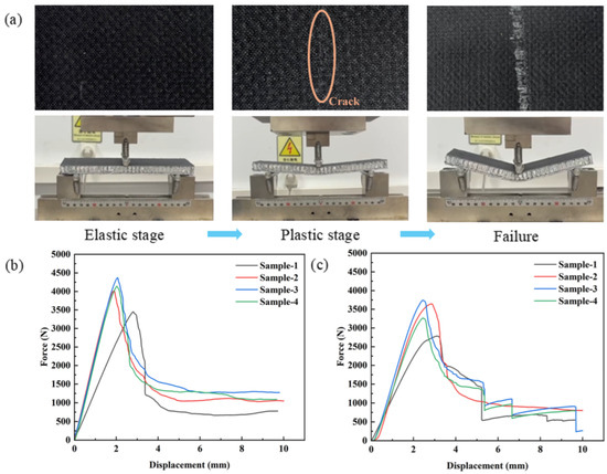 The three-point bending load–displacement curve of the samples with different hybrid ratios are shown in Figure 2. According to the load–displacement curve of the three-point bending of the sample in Figure 2, it can be seen that the tensile process of the sample node is divided into three stages, namely, the elastic stage, the plastic stage, and the sudden change stage of the strength peak. When the indenter begins to contact the specimen, the specimen begins to bear the load; at this time, it is in the elastic stage, and the specimen does not appear to have any damage. With the increase in load, the specimen enters the plastic stage, cracks begin to appear on the surface of the sample, and the sample begins to show irreversible damage, as shown in Figure 2a. When the applied load reaches the peak value, the load carried by the sample drops sharply, and the sample fails under severe damage (Figure 2a). Because of the existence of the honeycomb core, the sample still has a certain carrying capacity after the load redistribution, which is shown in Figure 2b,c.