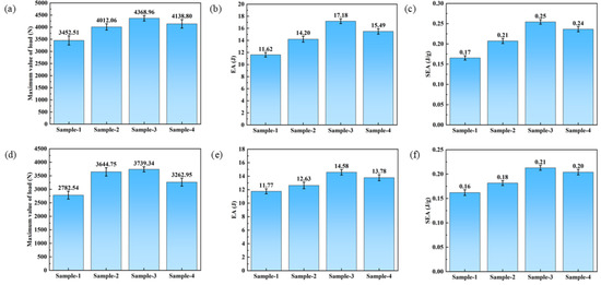 The three-point bending properties of samples with different hybrid ratios: (a) load–displacement curve along the L direction; (b) comparison of EA along the L direction; (c) comparison of SEA along the L direction; (d) load–displacement curve along the W direction; (e) comparison of EA along the W direction; (f) comparison of SEA along the W direction.