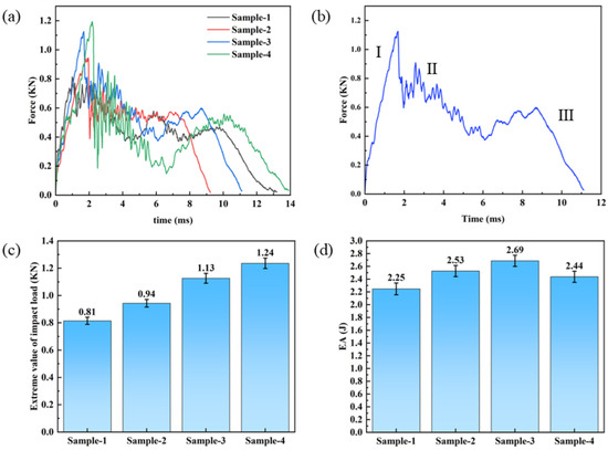 The low-velocity impact properties of samples with different hybrid ratios: (a) force–time curve; (b) impact process curve; (c) comparison of peak load; (d) comparison of EA.