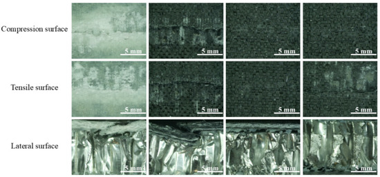 Figure 5 shows the macroscopic three-point bending damage morphologies of samples with different hybrid ratios. Damage first appeared on the compression surface under the impact point during the bending process. With the increase in load, the crack of the specimen expanded along the width direction, causing delamination and finally failure. By comparing the surface damage of samples with different hybrid ratios after bending failure, it was found that the most serious damage of S-1 occurred, with a large area of fiber buckling damage on the compression surface, matrix cracks, continuous fiber breakage on the tensile surface, obvious delamination between the panel and the core, and serious folding buckling. When carbon fiber is mixed in the glass fiber in the way of sandwich mixing, the panel can withstand greater loads and absorb more energy in the bending process, thus significantly improving the bending damage of the sample. Therefore, the damage of the sample is arranged according to the severity of S-1, S-2, S-4, and S-3. A comparative analysis of the damage patterns in samples 2, 3, and 4 reveals that the samples’ bending resistance improves with increasing hybrid ratio. However, beyond a critical threshold (>0.67), the enhancing effect of promiscuity on bending properties diminishes significantly, ultimately transitioning to detrimental impact. Therefore, it is necessary to obtain the optimal confounding ratio with the bending property as the target value, so that the wall confounding has a negative effect.
