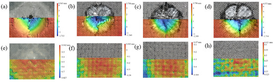 Impact damage morphology of the sample: (a) S-1 impacted surface; (b) S-2 impacted surface; (c) S-3 impacted surface; (d) S-4 impacted surface; (e) S-1 backwash surface; (f) S-2 backwash surface; (g) S-3 backwash surface; (h) S-4 backwash surface.