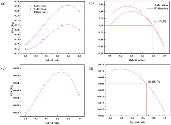 Fitting of the SEA to hybrid ratio of samples and its first derivative curve: (a) Bending SEA fitting; (b) derivative of bending fitting; (c) impact SEA fitting; (d) derivative of impact fitting.