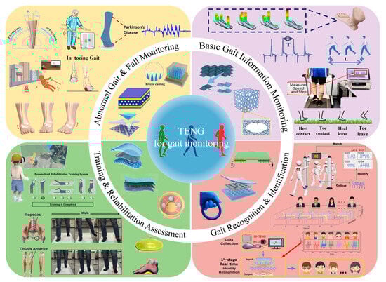 Applications of self-powered sensors based on TENGs in the fields of gait monitoring include basic gait information monitoring, abnormal gait detection and fall monitoring, rehabilitation assessment and assisted training, as well as identity recognition.