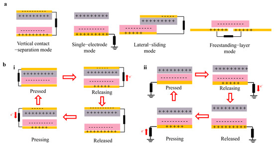 There are four basic working modes of a TENG: vertical contact-separation (C-S) mode, lateral-sliding (L-S) mode, single-electrode mode (S-E), and freestanding-layer (F-E) mode (Figure 2a). This review mainly introduces the common vertical contact-separation mode and single-electrode mode. The vertical contact-separation mode is the most fundamental mode of the TENG. It is composed of two friction layers with different electronegativities and electrodes stacked, where the electrodes are located at the opposite ends of the contact surfaces of the two friction layers. Under the action of an external force, the two friction layers approach each other and electron exchange occurs, which causes the two friction layers to carry equal amounts of opposite charges, respectively. When the two friction layers separate, the equal amounts of opposite charges between them form a potential difference. If the two electrodes are connected through an external load, electrons flow from the high-potential electrode to the low-potential electrode to achieve charge balance. When an external force is applied to the friction layers again, the transferred charges return to the original electrodes and generate a reverse current. When the friction layers repeatedly make contact and separate, the TENG can generate periodic alternating current (Figure 2(bi)).