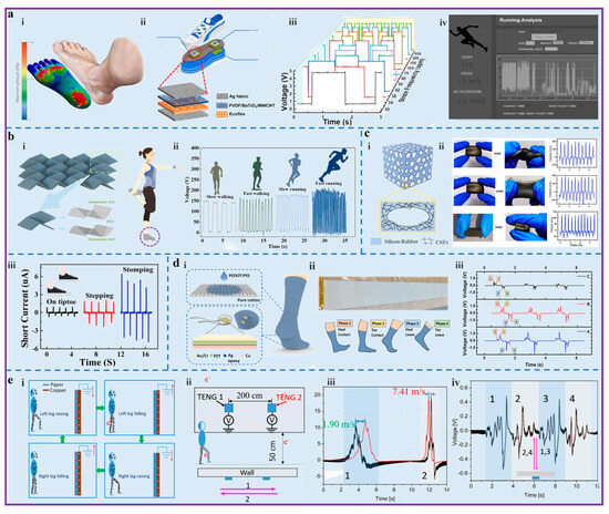 Human gait parameter information includes gait cycle, kinematic parameters, spatio-temporal parameters, kinetic parameters, etc. These parameters can objectively reflect an individual’s walking characteristics. In recent years, an increasing number of researchers of TENGs have shown great interest in self-powered gait monitoring sensors. Among them, some researchers have achieved gait monitoring by integrating TENGs into insoles or shoe soles. For example, Zhao et al. fabricated a TENG based on electrospun composite nanofibers to construct a self-powered gait analysis system. The system can monitor walking speed and acceleration and realize data visualization [61]. There are three TENGs in this system, and the placement of the sensors is determined through plantar pressure simulation analysis (Figure 3(ai)). Two of the TENGs form a sensing module and are placed at the forefoot and heel positions, and one TENG is used as a charging module and placed at the heel position (Figure 3(aii)). Gait monitoring is achieved by relying on the two TENGs in the sensing module to collect the electrical signals generated during walking. The original output signals are processed by a charge amplifier circuit and then converted into sensing signals readable by the microcontroller unit (MCU). The processed signals present as transistor–transistor logic (TTL) signals (Figure 3(aiii)). The two TENGs used for obtaining signals can acquire stable signals, and the TENG of the charging module can drive the MCU to collect and calculate data. Based on the above mechanism, Zhang et al. developed an application program that can not only record the gait parameters of the exerciser, but also realize the visualization of gait parameters (Figure 3(aiv)).