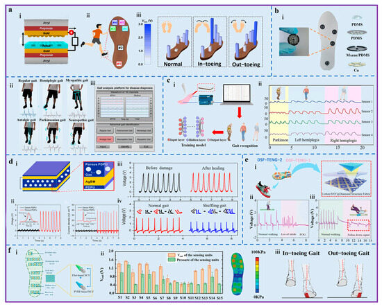 Applications of self-powered sensors based on TENG in the field of abnormal gait detection and fall monitoring. (a) A sensing system for monitoring in-toeing gait and out-toeing gait. (ai) Schematic diagram of complementary nanostructures. (aii) Distribution of the array on the sole. (aiii) Comparison of signal patterns between in-toeing gait and out-toeing gait. (b) Triboelectric sensors for diagnosing six types of abnormal gaits. (bi) Design of the insole and the materials and structures of the sensor. (bii) Characteristic signals generated by six common abnormal gait patterns. (biii) Gait analysis and diagnosis interface. (c) Sensing system for diagnosing the gait of Parkinson’s and hemiplegic patients. (ci) Schematic diagram of the process for diagnosing and identifying gaits. (cii) Voltage signals of Parkinson’s patients and left- and right-hemiplegic patients collected by real-time monitoring. (d) Triboelectric sensors for abnormal gait detection. (di) Schematic diagram of the structure of a porous TENG with gas–solid interaction. (dii) Electrical output of the porous TENG. (diii) Schematic diagram of self-healing ability. (div) Triboelectric sensors for gait recognition. (e) Abnormal gait and fall detection. (ei) Schematic diagram of the structure of the TENG. (eii) Signal monitoring of the walking pattern of Parkinson’s patients. (eiii) Fall signal monitoring. (f) Application of yarn-woven TENGs in abnormal gait detection. (fi) Yarn materials and distribution of sensors in the insole. (fii) Voltage output and stress distribution of the sensors during a standard gait. (fiii) Sole stress distribution in two abnormal gaits.