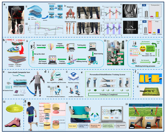 Applications of self-powered sensors based on TENG in the field of rehabilitation assessment and auxiliary training. (a) Self-powered gait analysis and long-term rehabilitation monitoring system. (ai) Schematic diagram of the gait monitoring device. (aii) Schematic diagram of the bionic sensor. (aiii) Signal response during the completion of the gait cycle. (aiv) Gait measurement of simulated patients. (av) Gait rehabilitation conditions for ACL tears and intervertebral disc protrusions. (b) Auxiliary training system based on triboelectric sensors. (bi) Structure of the insole integrated with two sensors. (bii) Schematic diagram of the process of the auxiliary training. (biii) The auxiliary training robot with the integration of triboelectric sensors. (biv) Schematic diagram of the specific process of gait training. (c) Structural design of the self-powered sensing network with multipoint distribution. (d) Process of the auxiliary training system. (di) Acquisition of patients’ gait signals. (dii) Gait recognition through machine learning. (diii) Doctors issue exercise prescriptions. (div) Carry out auxiliary rehabilitation training. (e) Human–machine interface of the personalized auxiliary rehabilitation training system. (f) Self-healing and high-temperature recoverable capabilities of the TENG. (fi) Schematic diagram of the self-healing ability. (fii) Schematic diagram of high-temperature recovery. (fiii) Corrective insoles are used for flatfoot support and signal collection. (g) Wearable multidimensional motion sensor for VR motion-assisted rehabilitation training. (gi) Schematic diagram of the wearable multidimensional motion sensor. (gii) VR control system and the complete operation process. (giii) Demonstration of the VR football shooting game.