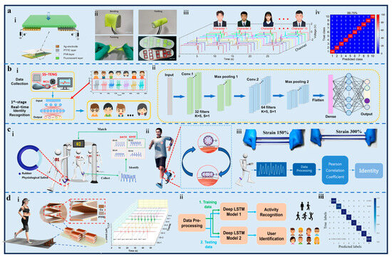 Applications of self-powered sensors based on TENG in the field of identity recognition. (a) Wearable triboelectric sensors with a PVA/acrylic fluorescent layer for identity recognition. (ai) Charge distribution when the upper and lower triboelectric layers are in contact. (aii) Resistance to mechanical deformation and the distribution of the sensing array in the insole. (aiii) Signals with different characteristics generated by different participants. (aiv) Confusion matrix for personal identification. (b) Identity recognition system based on the Internet of Things and artificial intelligence. (bi) The process of the identity recognition system collecting signal characteristics from different participants and completing identity recognition. (bii) CNN model for personnel identification and activity pattern recognition. (c) Identity recognition system realized by a replaceable triboelectric sensor. (ci) The process of identity recognition using a ring-shaped triboelectric sensor. (cii) Working mechanism of the ring-shaped triboelectric sensor. (ciii) Stretchability of the ring-shaped band. (d) Triboelectric sensors embedded in a carpet for identity recognition. (di) The schematic diagram of the gait sensors embedded in the carpet and the signal output characteristics of 8 users on the carpet. (dii) Architecture of the sensor system and the identity recognition process. (diii) Confusion matrix of the test dataset for 8 users.