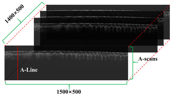 Our laboratory has independently developed an OCT scanning system to collect the tissue information from fingertips, as shown in Figure 1. It uses a broadband source with a central wavelength of 1310 nm and a bandwidth of 85.6 nm. The light can penetrate through the stratum corneum and the epidermis layer until reaching the dermis layer, and the maximum scanning depth can reach 4.64 mm beneath the skin. Each collection of fingertip volume data contains 1400 or 700 B-scan images. The size of each B-scan image is 1800 × 500, as shown in Figure 2.