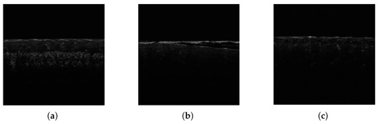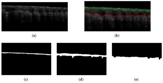 In this paper, each B-scan image in the dataset is divided into three regions, which are parts (c), (d), and (e) of Figure 4, respectively. The open-source image annotation software used is Labelme v4.5.12. As an image annotation tool, it is often used in the field of image segmentation. After using marking points of different colors to encircle the contours of each layer of the tissue structure in the B-scan image, Labelme will output the final annotation result. Among them, the area surrounded by the green markings is regarded as the glass layer, and the viable epidermis junction layer is marked as the red area. When the stratum corneum is not attached to the glass layer, the upper edge of the green area is regarded as the glass layer, as shown by the upper boundary of the green area in the figure. The part between the green and red areas is regarded as the stratum corneum.