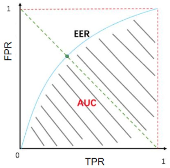 AUC calculates the area under the curve. The curve usually refers to the receiver operator characteristic curve (ROC) or the precision–recall curve (PRC). In this paper, the area under the ROC curve is used. The value of AUC ranges from 0 to 1. The closer it is to 1, the better the model performance. When the AUC value is 1, it means that the model’s prediction is completely correct. The ROC curve provides a graphical analysis interface. The abscissa represents the false positive rate (FPR), and the ordinate represents the true positive rate (TPR), which is also called the recall. FPR indicates the proportion of spoof samples that are wrongly judged as bona fide samples among all spoof samples, and TPR indicates the proportion of bona fide samples that are correctly judged as bona fide samples among all bona fide samples. As shown in Figure 5, the shaded part represents the AUC, and the intersection point of the green dotted line and the blue ROC curve represents the value when FPR is equal to TPR. Therefore, the performance of the classification method can be intuitively measured through the ROC curve. The closer the ROC curve is to the upper-left corner, the better the model performance. In this case, the true positive rate is higher and the false positive rate is lower. Therefore, the AUC curve is an important metric for evaluating the performance of binary classification models, which can reflect the model’s prediction ability and accuracy.