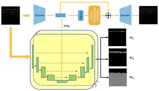In this section, three segmentation networks with different structures are used to separate the OCT fingertip images of different tissue structures. Through pre-training, the training parameters of different segmentation networks are obtained. When the pre-processed data are input, the images are, respectively, input into the two branches of the segmentation network and the reconstruction network. By fixing the parameters of the segmentation network, it can be free from the interference of the parameters of the reconstruction network. Finally, the high-dimensional semantic features of the model are obtained by reconstructing the image with an auto-encoder added with a variational attention module. The weights obtained from the analysis are fused with the tissue features in the segmentation model to obtain a feature map, and then reconstruction is carried out to obtain the final output result.