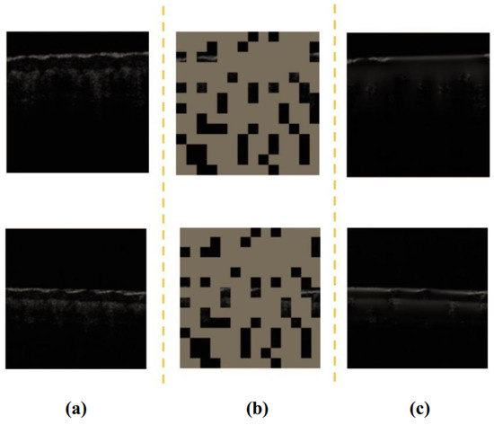 Reconstruction for pixel block mask. (a) Original OCT image. (b) Masked image. (c) Reconstructed image.