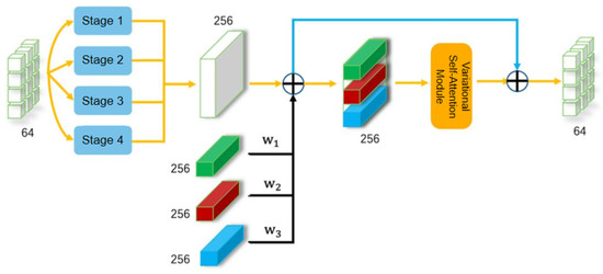 This method uses the Swin Transformer as the backbone network for feature extraction. is the multi-scale feature task map of the image obtained through the Swin Transformer. , , and are the weights converted from the proportions of the task contribution degrees of different fingertip sample tissues obtained previously. As shown in Figure 10, the obtained multi-scale feature task map and the feature map after fusing the segmentation fusion features are further processed for the fused features through a self-attention residual network. Through the attention mechanism, the dependencies between the fused features can be captured, and the problem of gradient vanishing can be effectively alleviated.