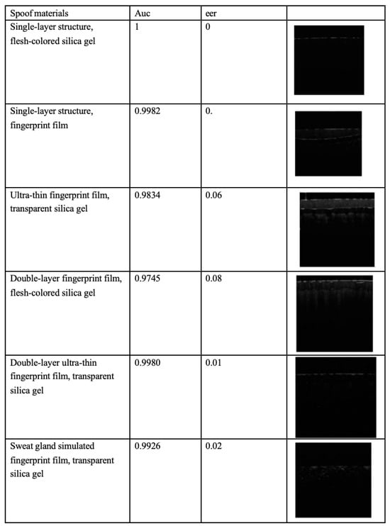 As shown in Table 1, for spoof samples made from fingerprints of different materials, the OCT scanning results also vary. Ordinary single-layer silica gel samples have a simple organizational structure. For the double-layer film fingerprint structure, as different materials are added during the production of spoof samples, the refractive index of light during OCT acquisition is different in the two materials. Therefore, an obvious double-layer structure will appear, posing a great challenge to current anti-spoofing methods. Polystyrene microspheres and conductive silver particles in the fingerprint film can simulate the sub-dermal sweat gland tissue of bona fide fingerprints, which also makes it difficult to distinguish between bona fide and spoof samples.