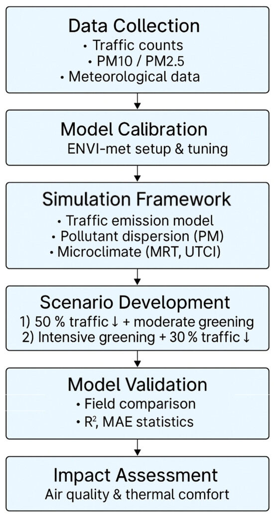 The methodological framework adopted, summarized in Figure 1, includes several phases: data collection (meteorological and traffic), model calibration, integrated simulation of traffic emissions, pollutant dispersion and microclimate, scenario development, validation using field data, and assessment of environmental and climatic impacts.